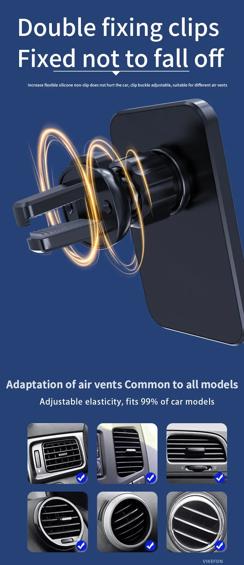 Safe Installation: This car phone holder is equipped with an updated version of the ventilation clip, which can securely fix your smartphone to the car ventilation.
