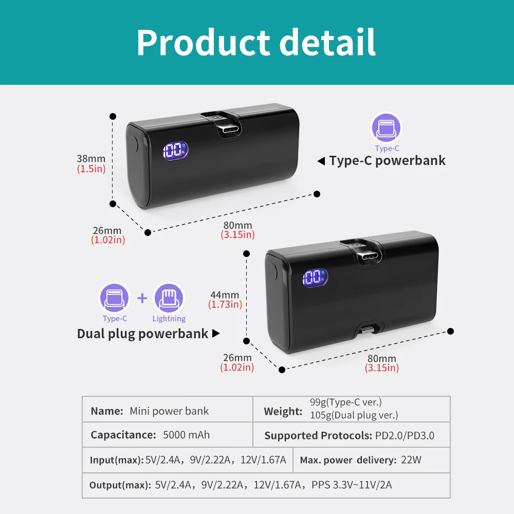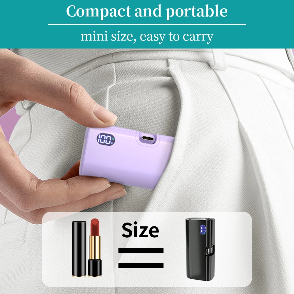 5000mAh Mini Power Bank Portable Fast Charging Type-C Lightning Dual Foldable Plug Charger for IPhone TECNO MI External Battery
