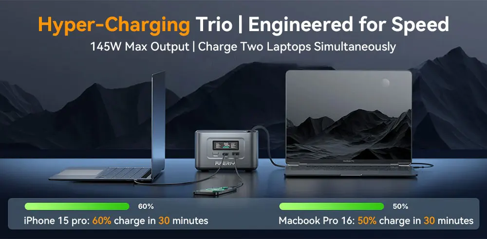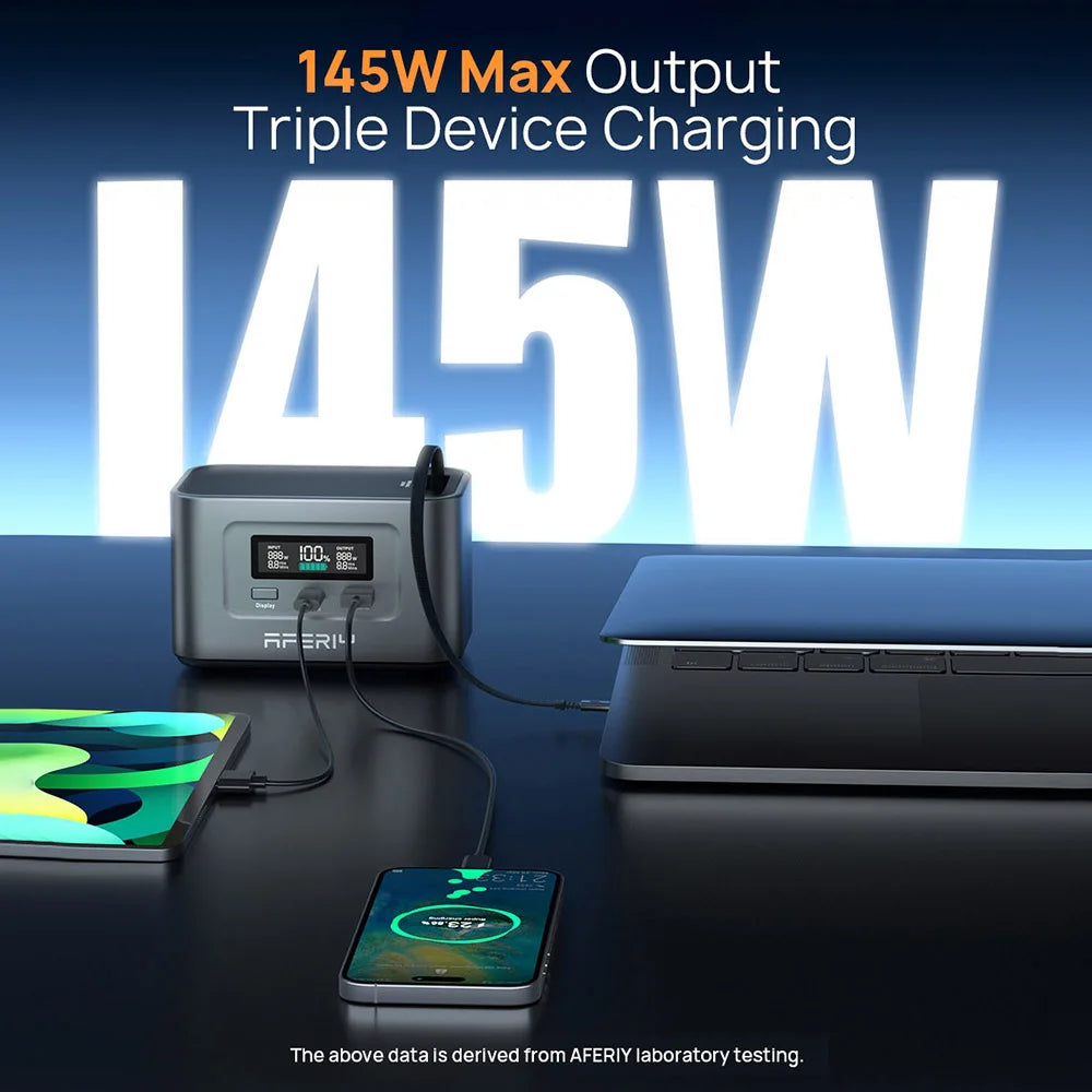 The AFERIY Nano 100 is a compact portable power source that uses 2 USB-C ports for a maximum output of 145W. The included cable allows 100W input and output. With 2 USB-C ports and 1 USB-A port, you can charge multiple devices simultaneously such as smartphones, tablets, and laptops. Fully charged in about 1.5 hours, and it is perfect for business, travel and outdoor activities. Does not support AC output.
