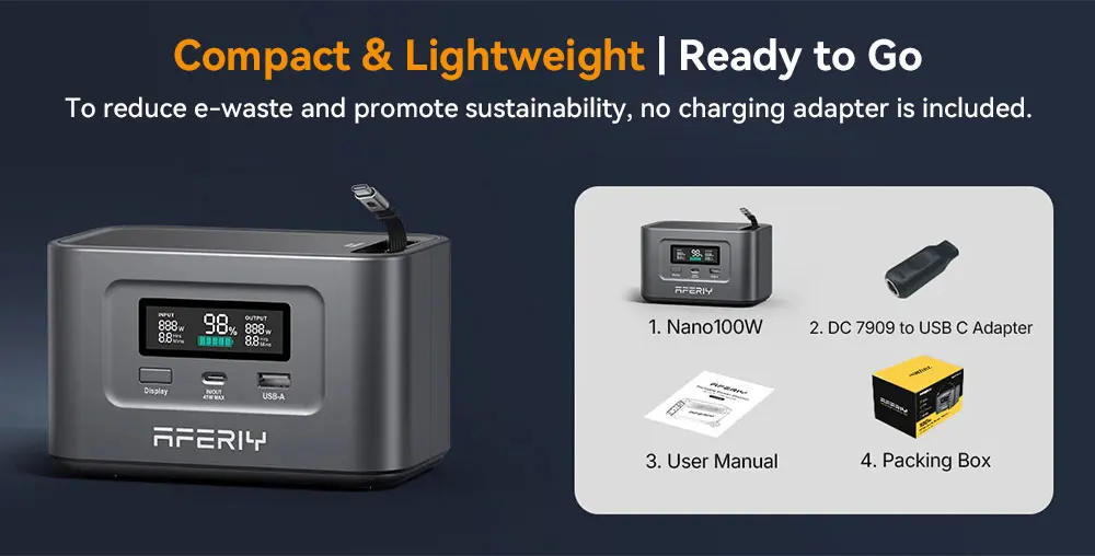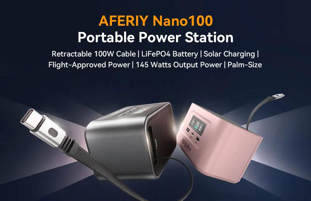 AFERIY Nano100 Portable Power Station, 100W 99.2Wh, Telescopic Type-C Cable, 1.5h Full Charge, 3000+ Cycles LiFePO₄ Battery