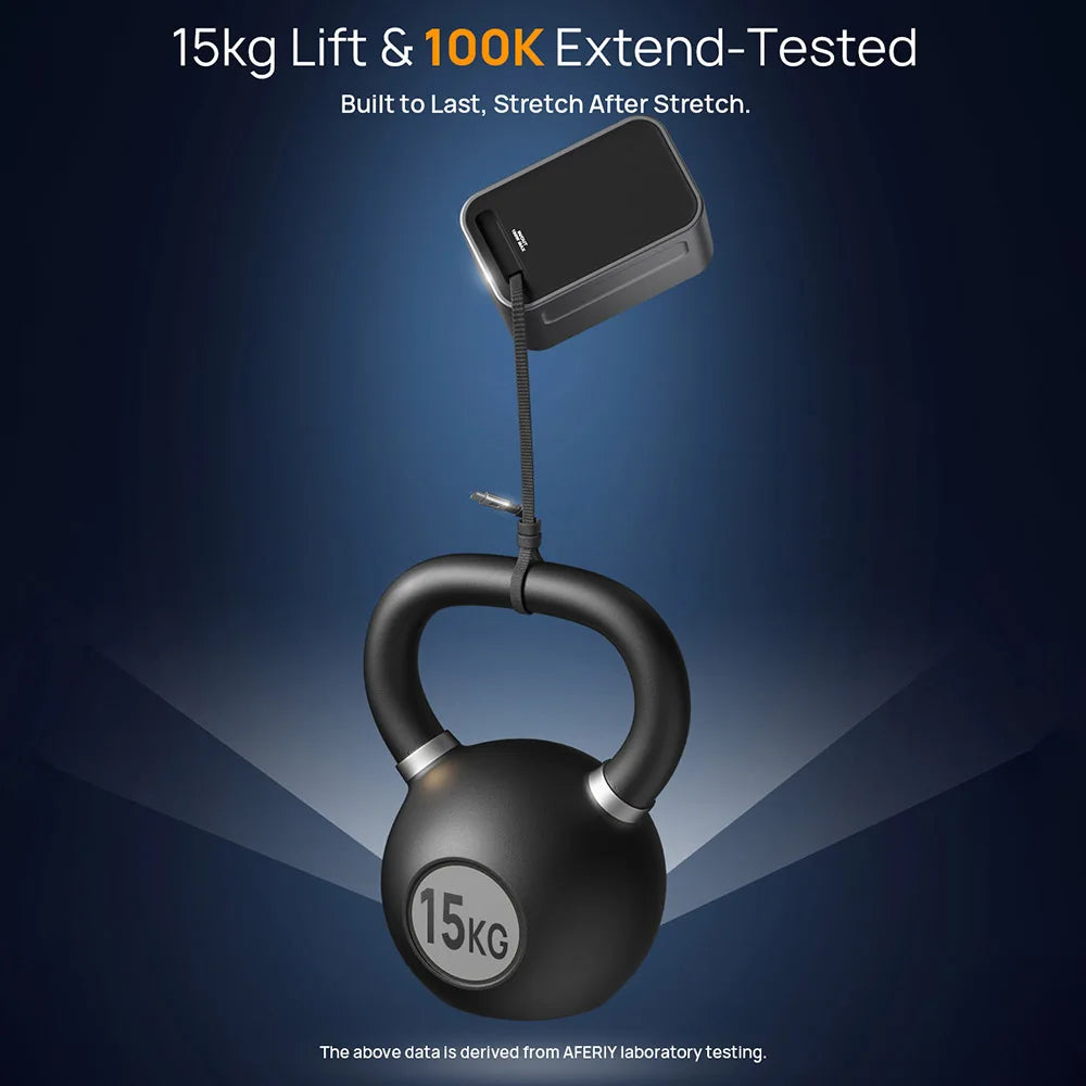 Built-in telescopic Type-C cable that can be freely extended up to 28.0 inches (71 cm). The durable design boasts a load capacity of about 33.1 lbs (15 kg) and automatically contracts in about 4 seconds after use. Resistant to repeated stretch and bending, this one-piece design is smart enough to carry without the need for a separate cable.