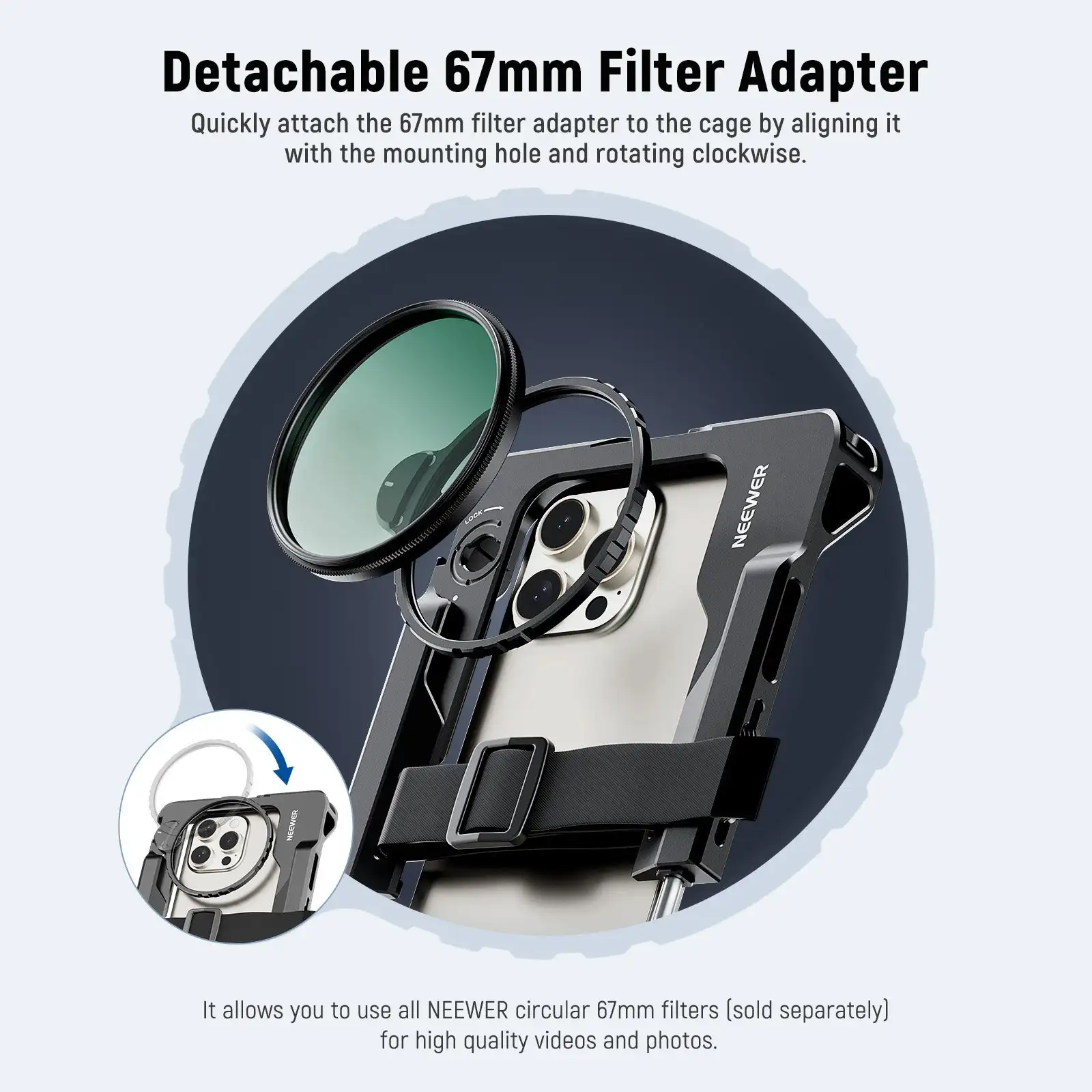 Detachable 67mm Filter Adapter- Quickly attach the 67mm filter adapter to the phone cage by aligning it with the mounting hole and rotating clockwise. It allows you to use all NEEWER circular 67mm filters (sold separately) for high quality videos and photos, including ND, CPL, UV, ND/PL, VND, Black Diffusion, stars, light pollution reduction, gold/blue streak, graduated color lens filters